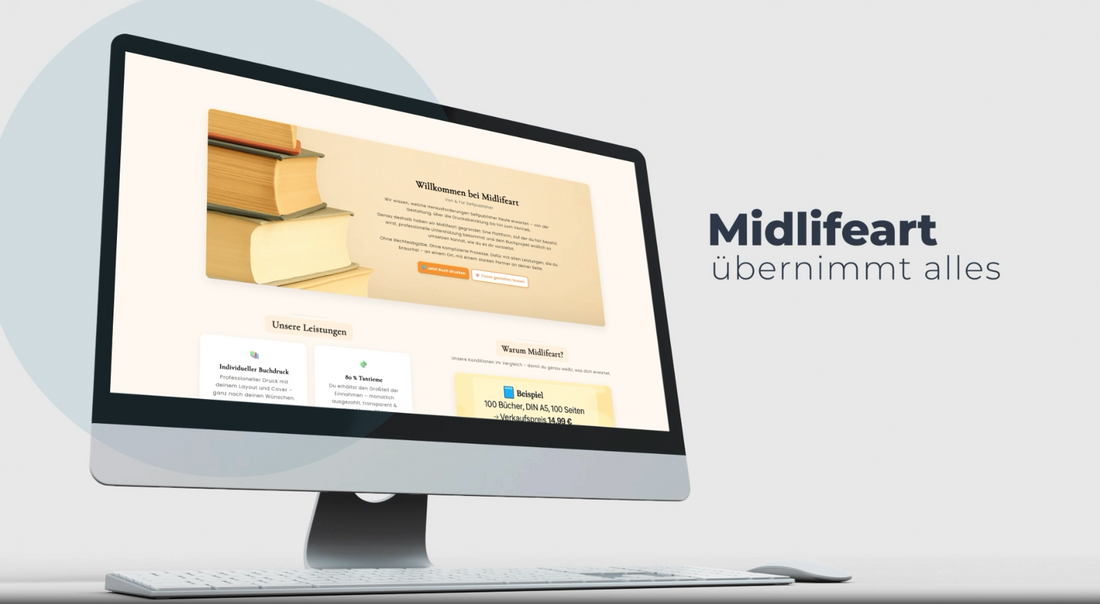 Bei Midlifeart bekommst du alles, was du als Selfpublisher brauchst: Qualitativer Buchdruck, Lagerung, Verkauf und Versand über unseren Shop – mit 80 % Tantieme und professioneller Unterstützung, ganz ohne Vertragsbindung.